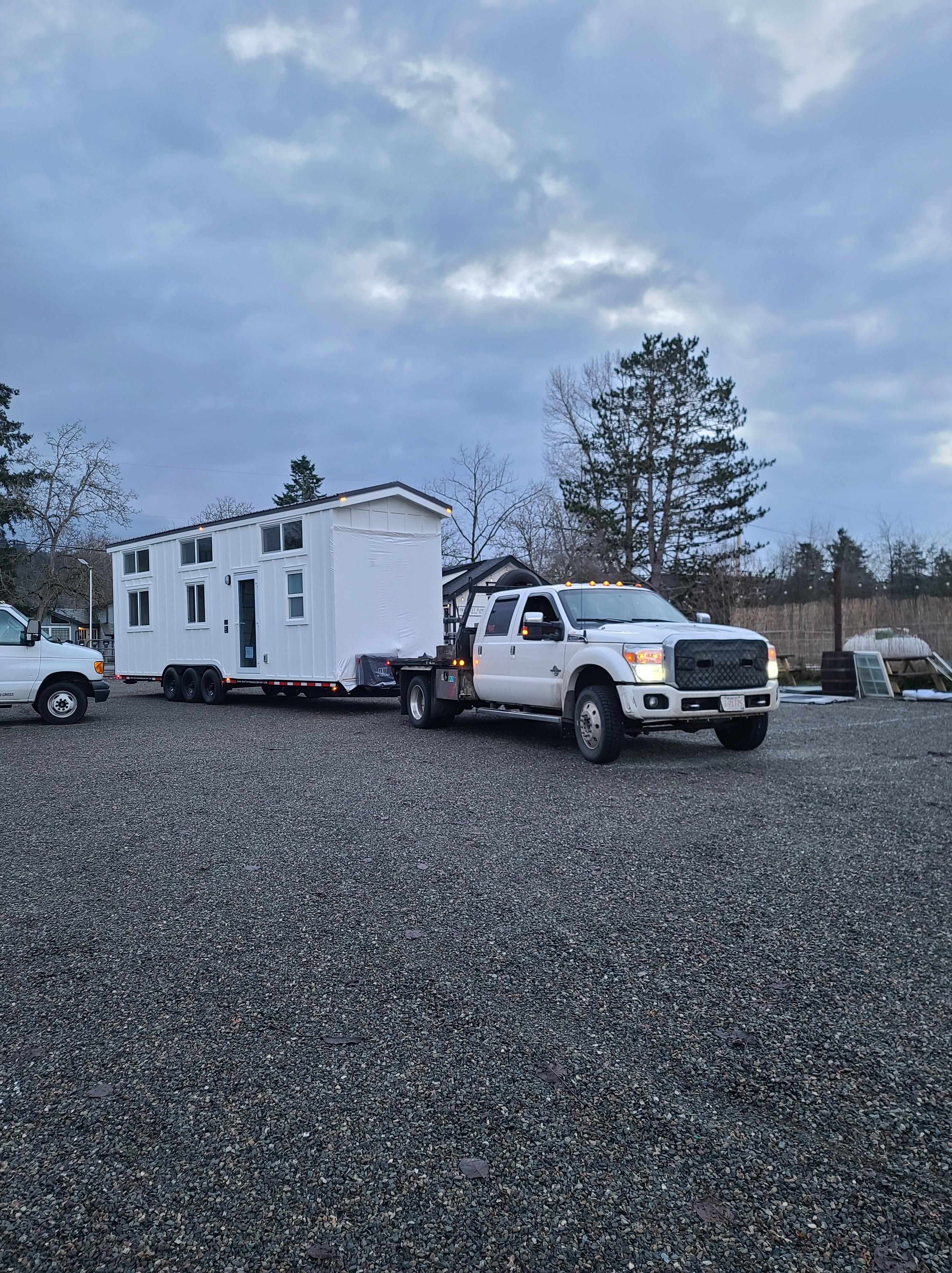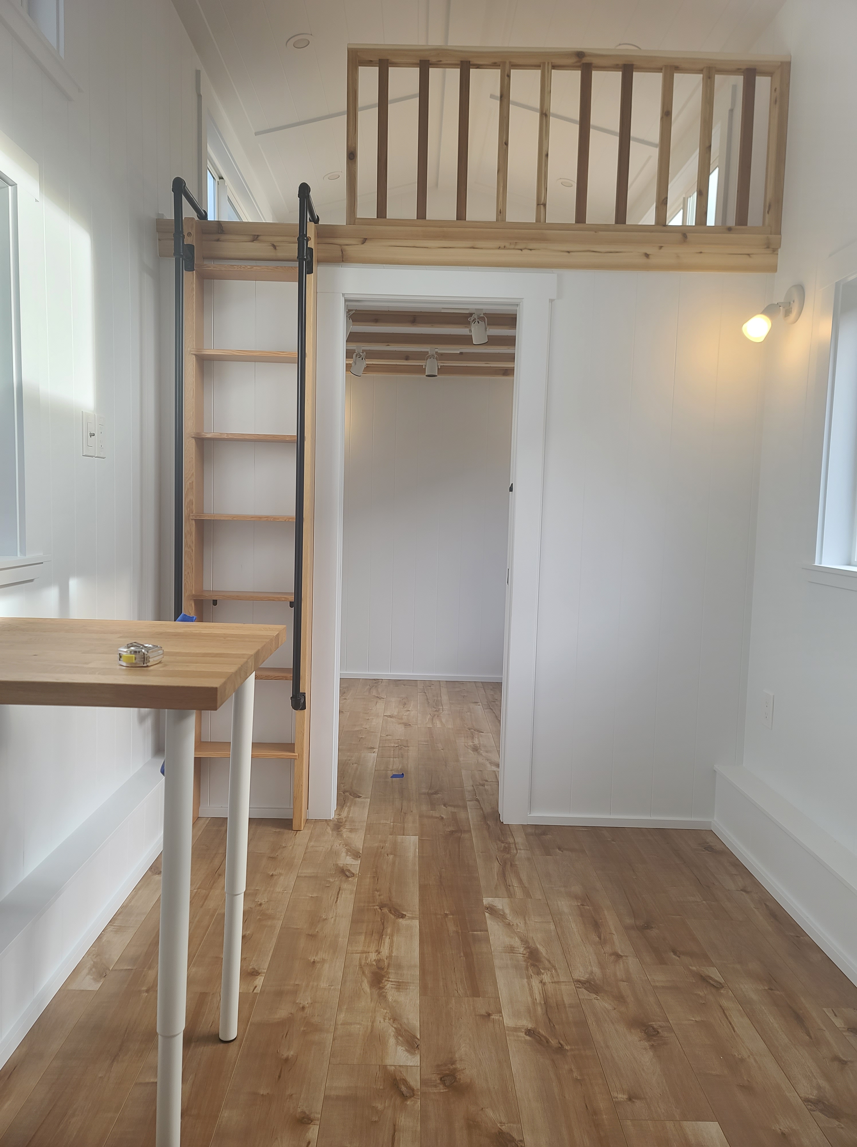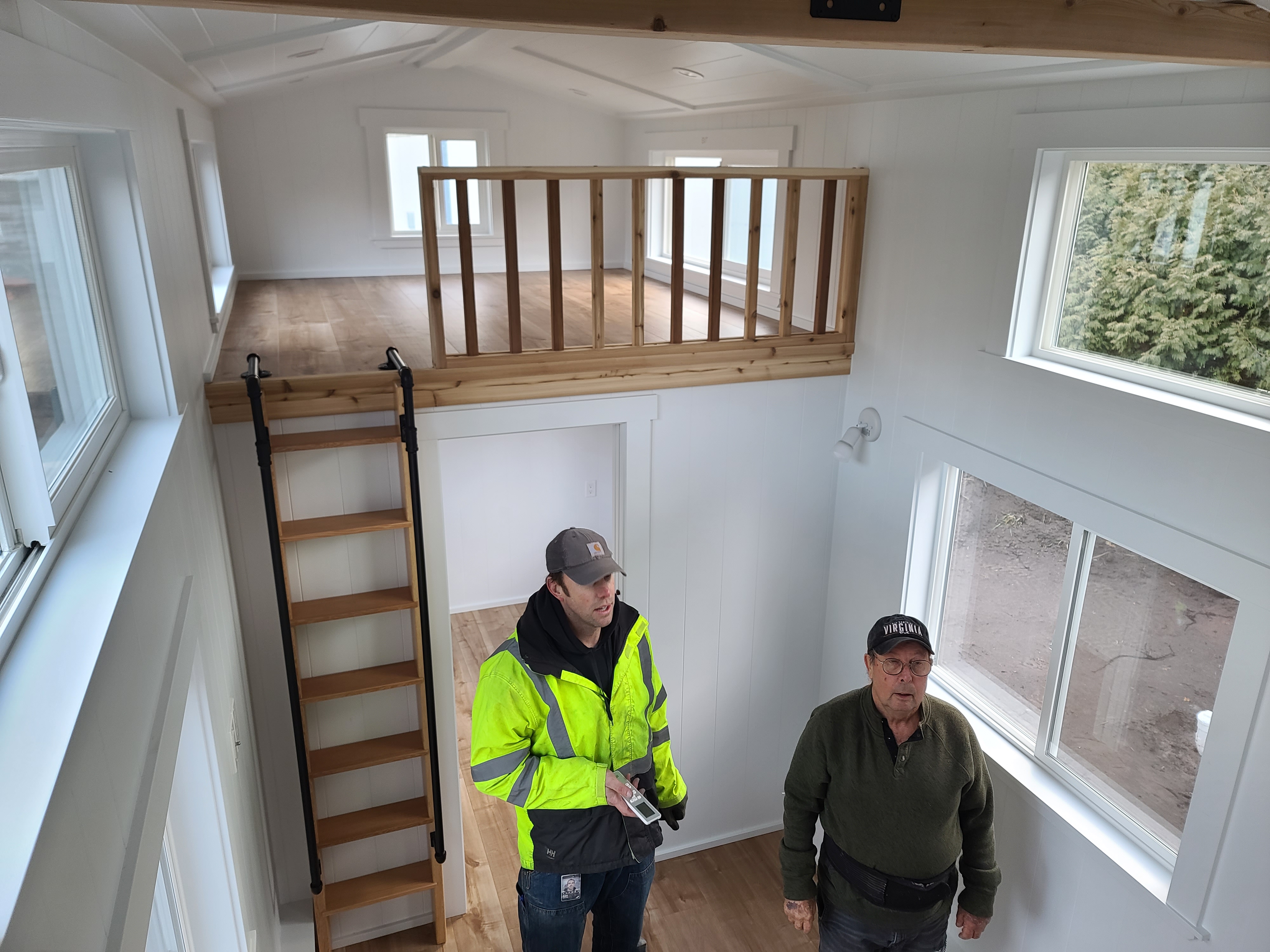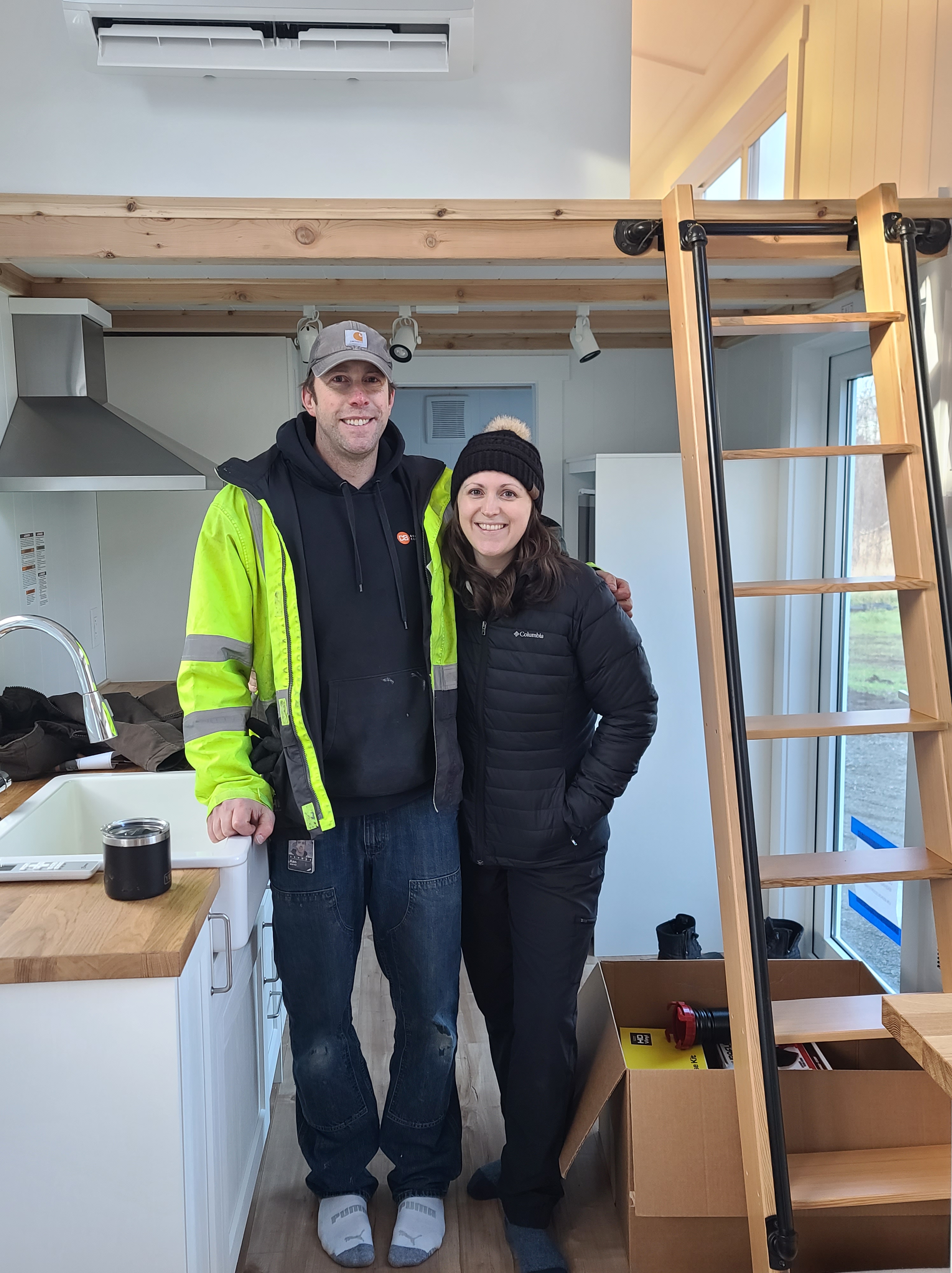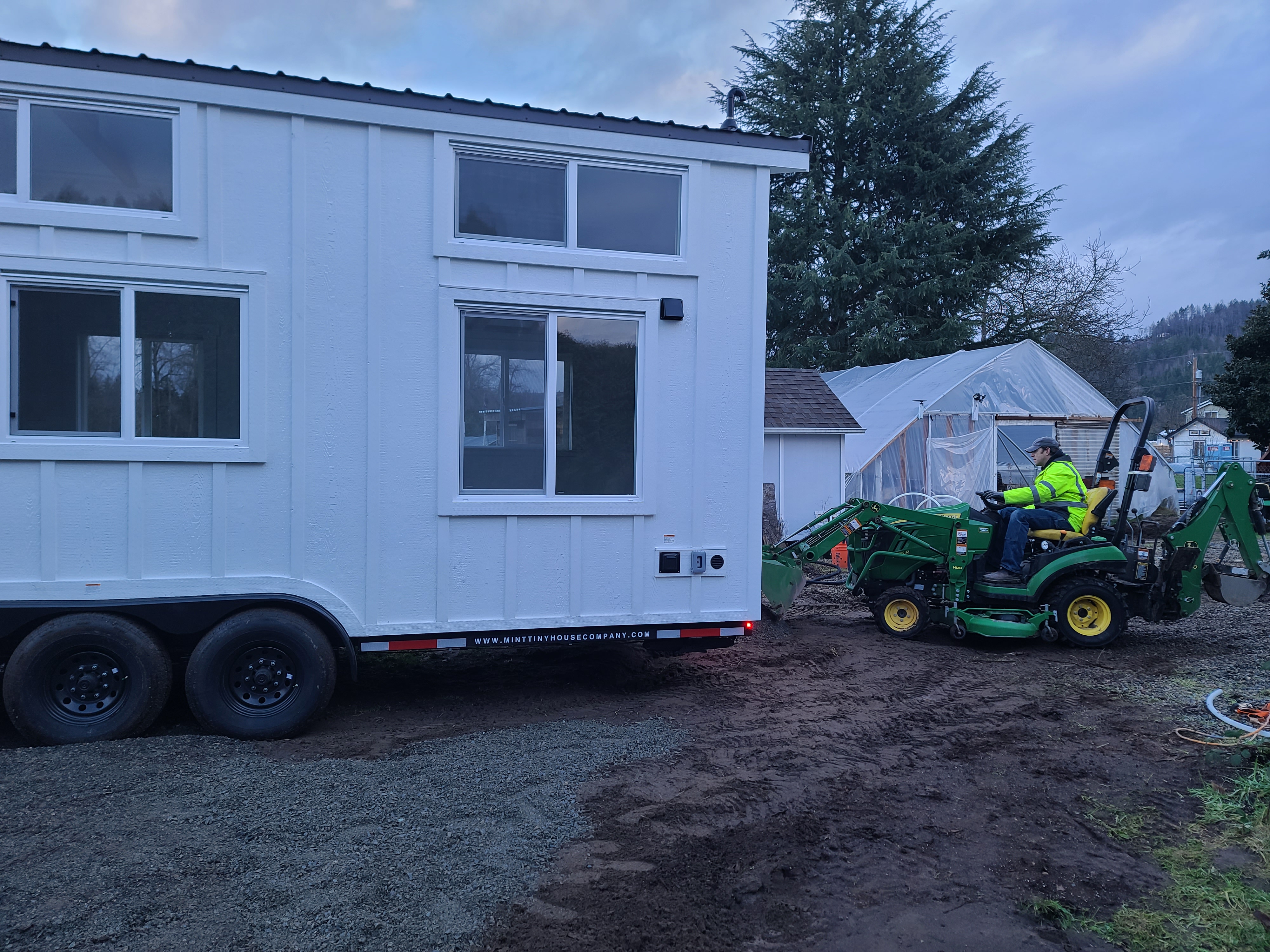Joe had a close call at the corner, but gunned it when he started sliding and made it. The following hour was spent doing about a 30 point turn while using sheets of plywood for the really muddy parts, in order to get the home situated to overlook the flower field, highland cow and alpacas! Joe and Ken finally got it there though. Our electrical cord ended up being too short…so Linds and I took off looking for another RV electrical cord while the guys “tested” everything else. Joe couldn’t leave until all the “things” on the tiny home were tested and shown to be in perfect working order. All in all, it took about 4 hours to get it in to place. And it was a pleasant and beautiful morning for it! We were so grateful for that. Eventually a deck will be built to come out the front and we’re adding some shelving and things to the inside before we move in. Below are some pictures of the inside including one with our friends who run the farm.