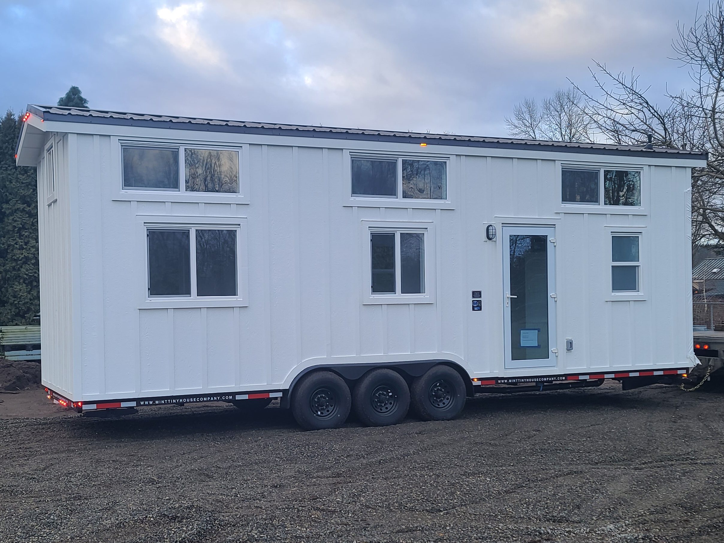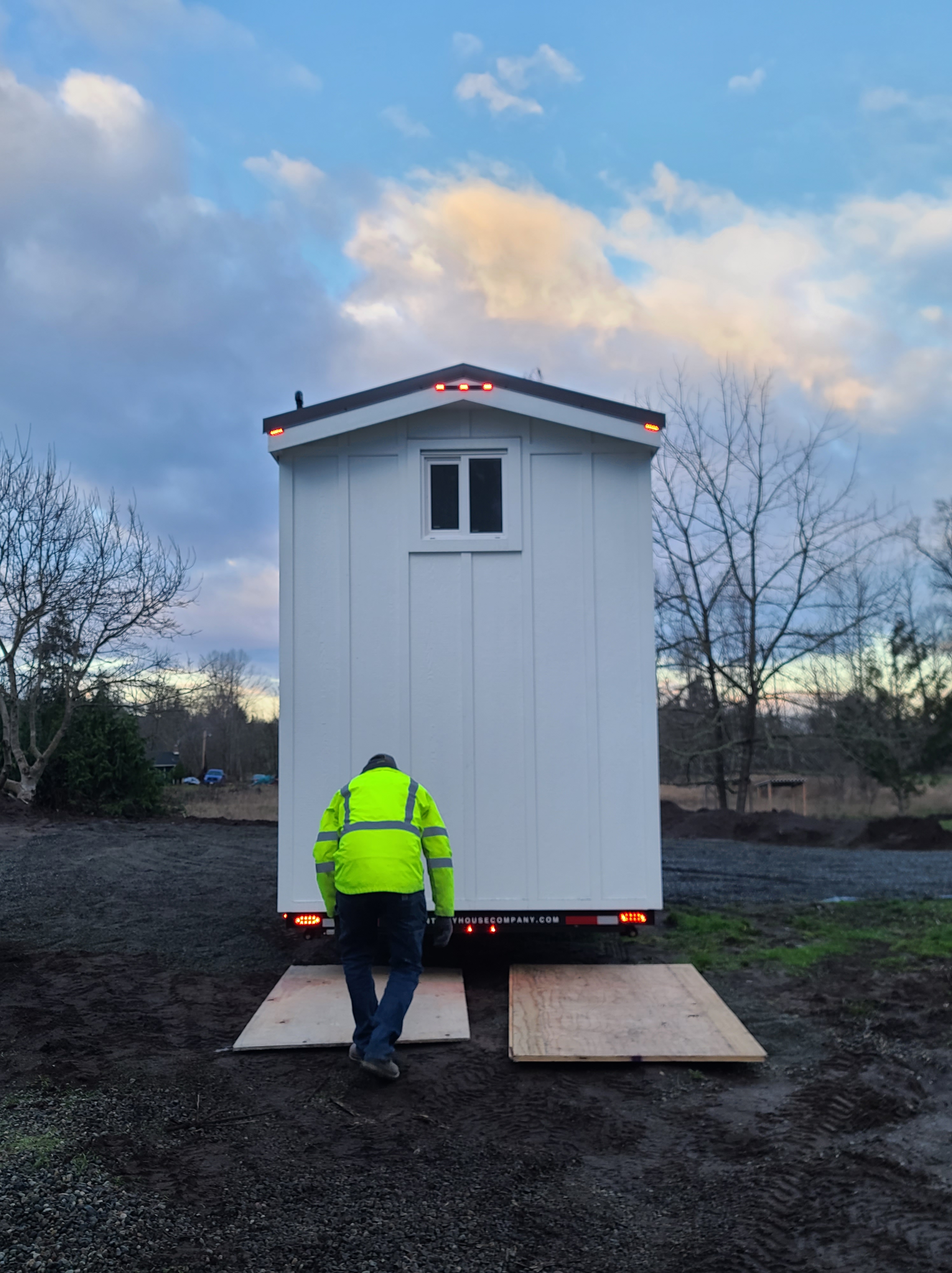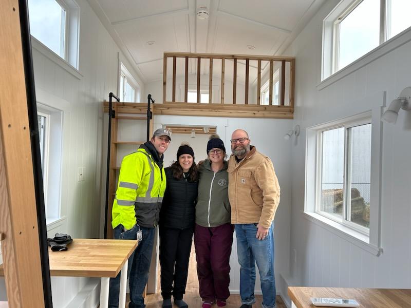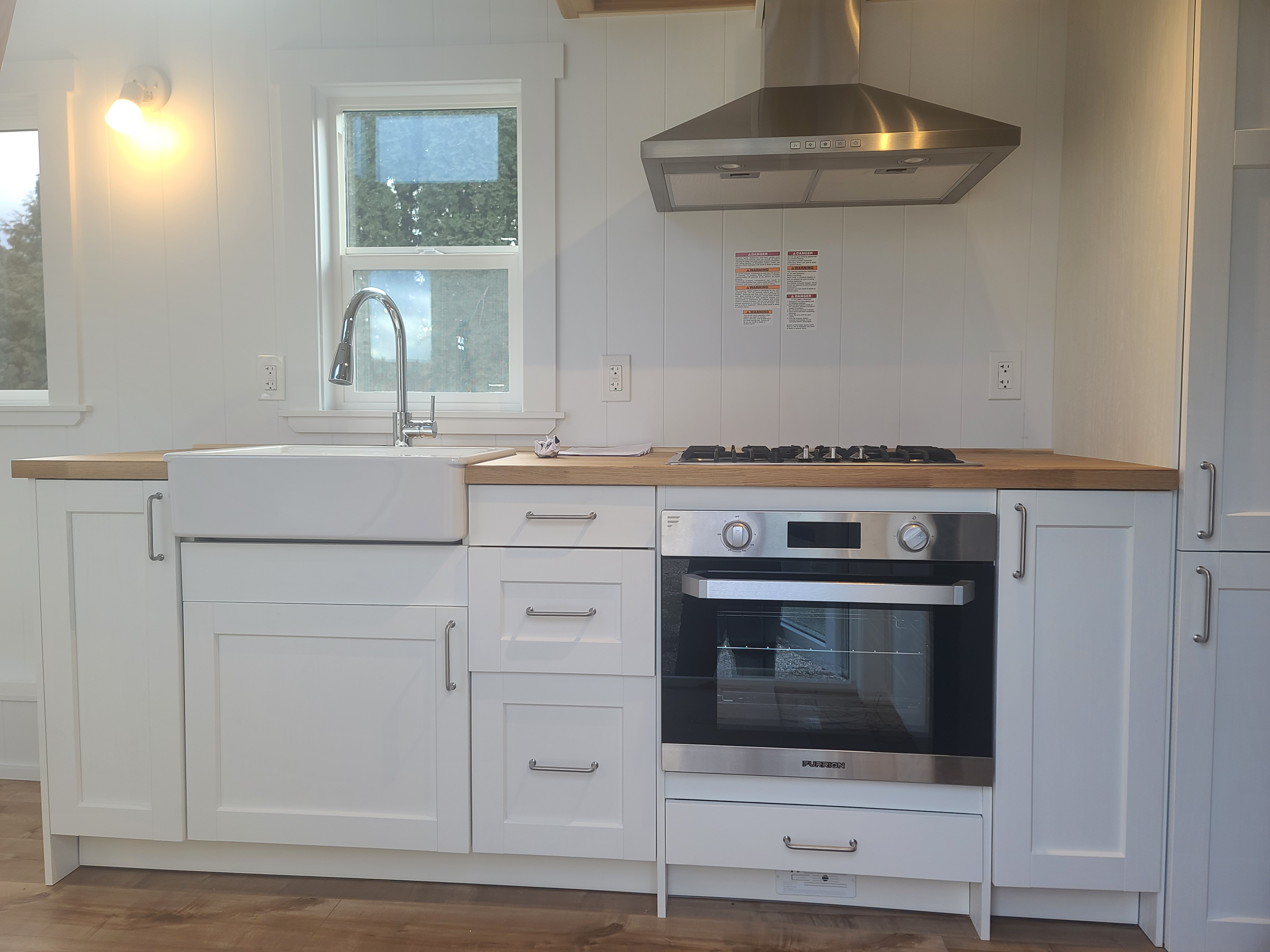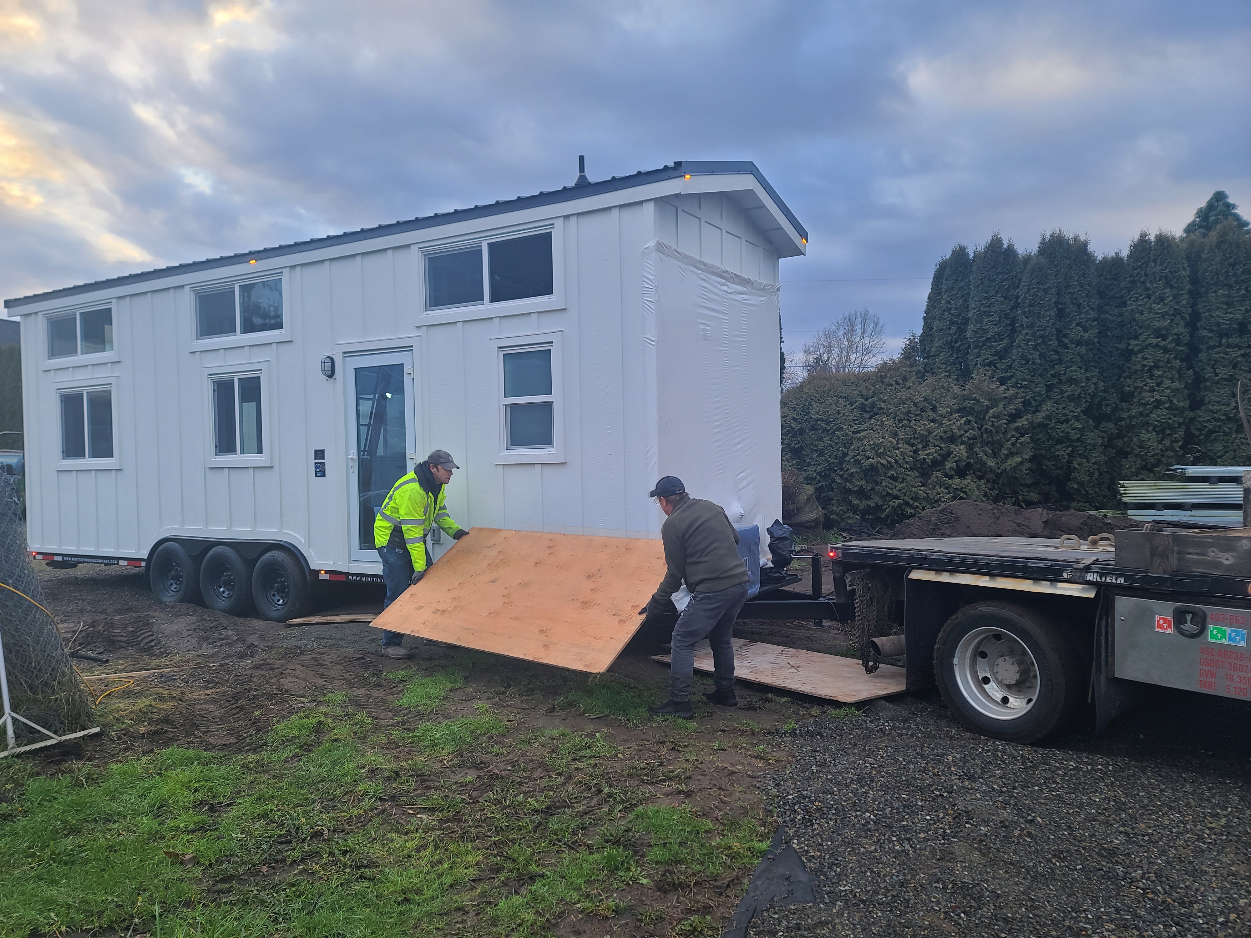 Joe had a close call at the corner, but gunned it when he started sliding and made it. The following hour was spent doing about a 30 point turn while using sheets of plywood for the really muddy parts, in order to get the home situated to overlook the flower field, highland cow and alpacas! Joe and Ken finally got it there though. Our electrical cord ended up being too short…so Linds and I took off looking for another RV electrical cord while the guys “tested” everything else. Joe couldn’t leave until all the “things” on the tiny home were tested and shown to be in perfect working order. All in all, it took about 4 hours to get it in to place. And it was a pleasant and beautiful morning for it! We were so grateful for that. Eventually a deck will be built to come out the front and we’re adding some shelving and things to the inside before we move in. Below are some pictures of the inside including one with our friends who run the farm.