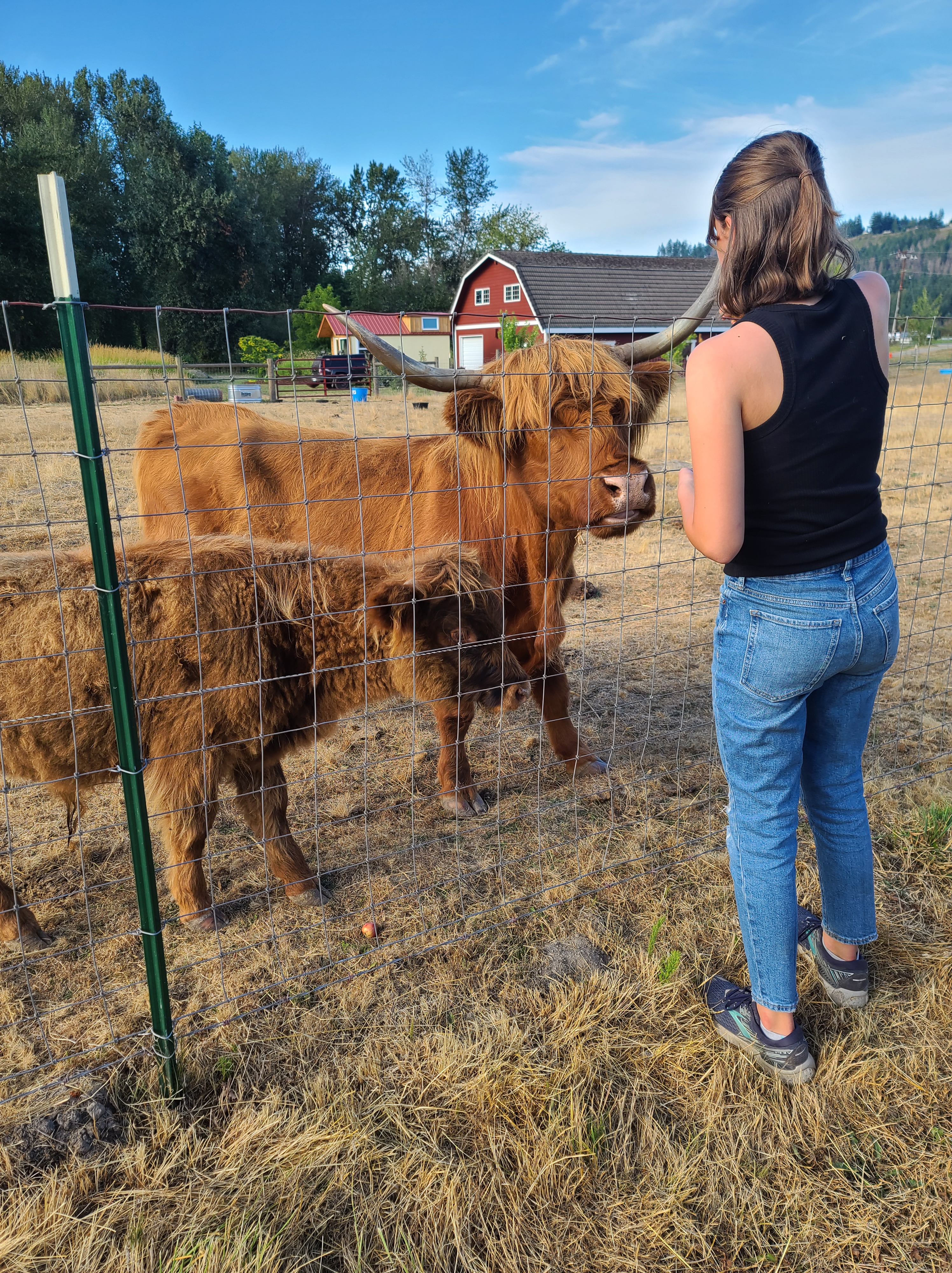 So there’s this cow that the farm doesn’t own but is right next to the property. Again, like everything else on the farm, the cow is not a normal cow. Her name is Isabell and I am partially afraid of her. Hey, her massive horns with long hair covering her eyes is very scary. She looks like she has long hair that you braid more than the short black and white short hair that is normally on a cow.