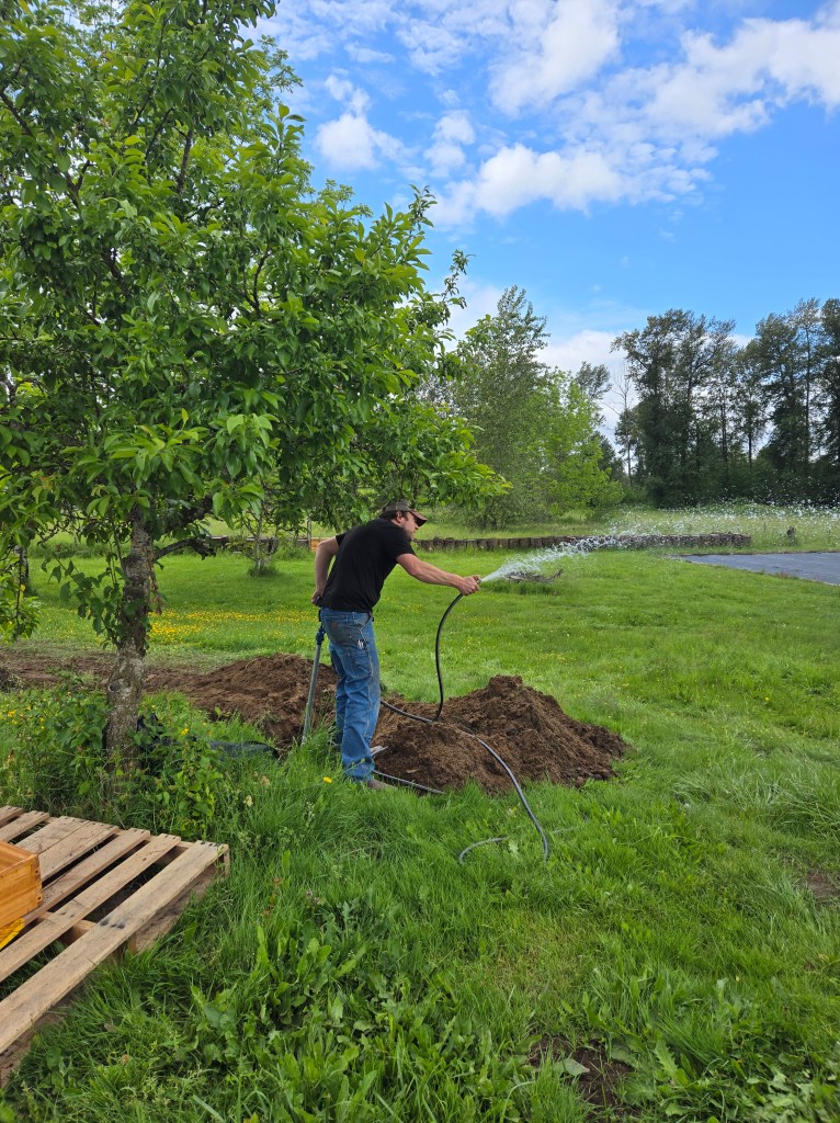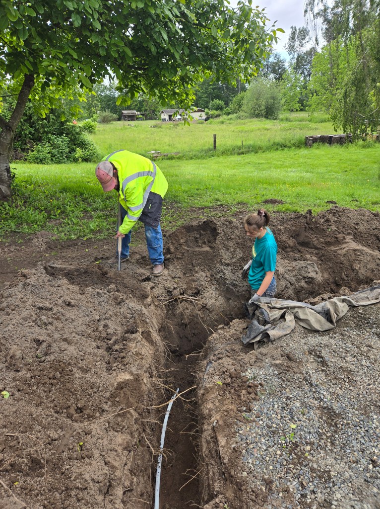 Two major things on the “move in” list (that were never completed) were wrapped up as well! One: Ken had thrown conduit in the ground with the waterlines to eventually run cable back to the tiny house. (At the time, cable was not a priority in comparison to water and septic systems. Haha!) So thankful for the thinking ahead though because in one day he was able to run it from “the neighbors” underground to our place which makes multiple people working or doing homework at one time possible now! Yay! The second major item was finishing out the water lines past the tiny house to hydrants in the field. Ken and Kylee spent a weekend trenching, laying pipe and backfilling so the farm had two more hydrants in the back field for all the flowers and farm needs. Having those two major things off the list felt good…and doing so when it wasn’t raining or freezing felt like a luxury!